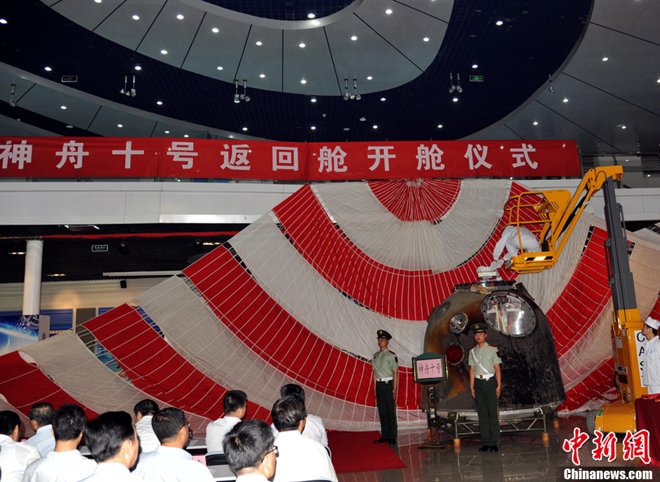 6月28日下午,中国载人航天工程办公室和中国航天科技集团公司,在北京航天城内神舟飞船“娘家”——中国空间技术研究院举行神舟十号返回舱开舱仪式。 孙自法 摄