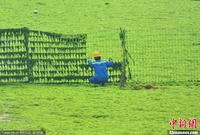 6月28日,大范围浒苔在青岛各海湾登陆,夏天来青岛看草原成了一景。自从2008年开始,青岛在每年夏季开始遭受浒苔的影响,这种从中部海域飘来的大片水藻一度威胁到奥运会帆船比赛的进行,更成了青岛人心中的梦魇。但是随着每年处置的经验,对于浒苔人们不再谈浒变色,反而进行开发利用,目前浒苔已经可以制成有机肥等材料,对于浒苔的海上拦截和陆地处理也越来越成熟。图为工作人员正在清理浒苔。兰一 摄 图片来源:CFP视觉中国