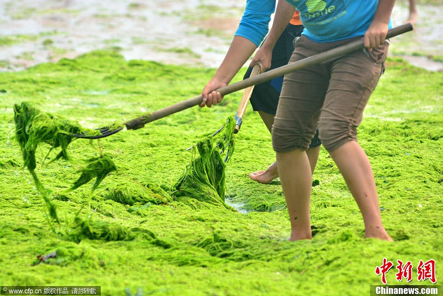 6月28日,大范围浒苔在青岛各海湾登陆,夏天来青岛看草原成了一景。自从2008年开始,青岛在每年夏季开始遭受浒苔的影响,这种从中部海域飘来的大片水藻一度威胁到奥运会帆船比赛的进行,更成了青岛人心中的梦魇。但是随着每年处置的经验,对于浒苔人们不再谈浒变色,反而进行开发利用,目前浒苔已经可以制成有机肥等材料,对于浒苔的海上拦截和陆地处理也越来越成熟。图为浒苔清理队员正在厚厚的浒苔中清理。兰一 摄 图片来源:CFP视觉中国