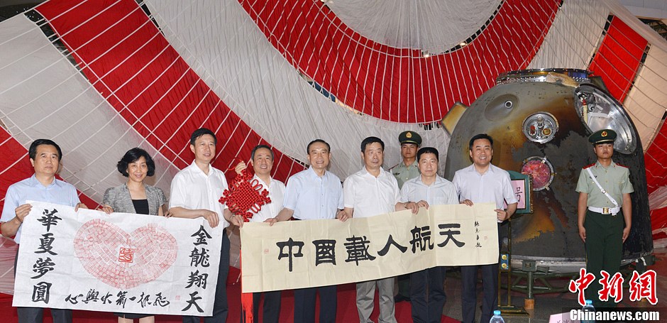 6月28日下午,中国载人航天工程办公室和中国航天科技集团公司在北京举行神舟十号返回舱开舱仪式。来自研制单位和搭载单位的代表一道,共同见证搭载物品出舱。出舱仪式在中国空间技术研究院举行,这里也正是神舟飞船的“出生地”,随着一声“开舱”指令下达,工作人员使用开舱“钥匙”打开返回舱,陆续取出搭载的物品。随后,在开舱现场进行了搭载物品的移交。中新社发 秦宪安 摄