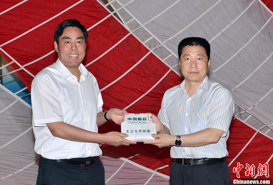 6月28日下午,中国载人航天工程办公室和中国航天科技集团公司在北京举行神舟十号返回舱开舱仪式。来自研制单位和搭载单位的代表一道,共同见证搭载物品出舱。出舱仪式在中国空间技术研究院举行,这里也正是神舟飞船的“出生地”,随着一声“开舱”指令下达,工作人员使用开舱“钥匙”打开返回舱,陆续取出搭载的物品。随后,在开舱现场进行了搭载物品的移交。图为中国载人航天工程办公室副主任杨利伟向安徽阜阳常务副市长卢仕仁交接优质小麦和大豆种子。中新社发 秦宪安 摄