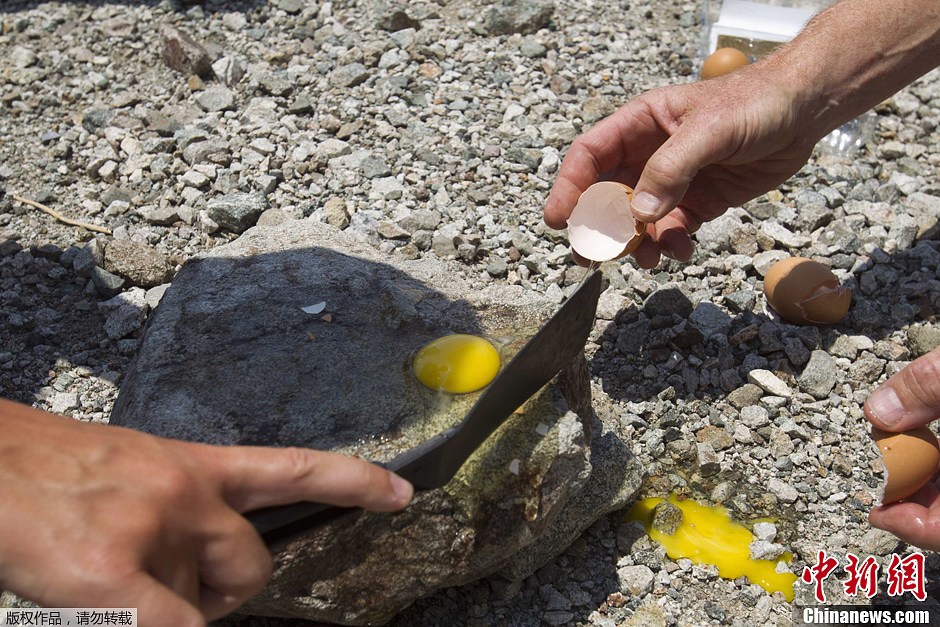 近日,美国西部多个地区遭遇极端高温酷热天气,凤凰城、拉斯维加斯等多个城市最高气温超过45℃。图为当地时间6月29日,美国加利福尼亚州“死谷”的最高气温飙升至130℉(约54℃),游客在岩石上摊鸡蛋。。