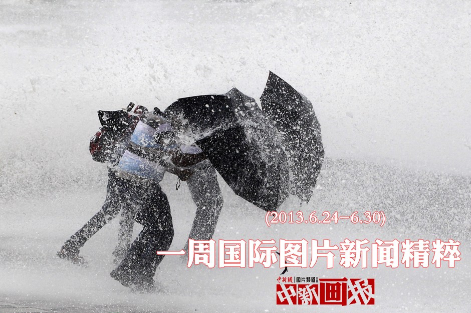 海边漫步:周二(25日),印度孟买,人们打着伞迎着季风雨走在海边。当时海水正在涨潮。