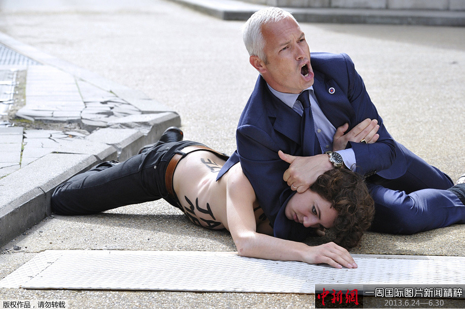 周二(25日),比利时首都布鲁塞尔,一名保安将女权组织的一名活动人士制服在地。数名该组织成员裸着上身袭击了突尼斯总理拉哈耶德(Ali Larayedh)的车队,对该组织其他成员在突尼斯被捕表示抗议。