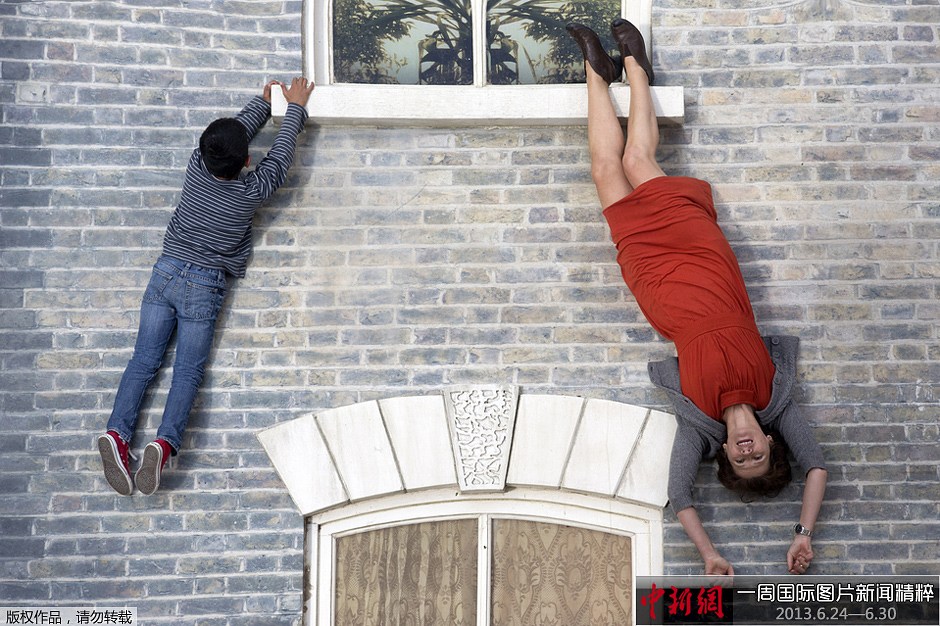 周二(25日),伦敦,人们和埃尔利赫(Argentine Leandro Erlich)设计的艺术装置“多尔斯顿住宅”(Dalston House)互动。该装置在地面上仿造了一座维多利亚风格住宅的正面,并在上方某个角度设置了一面大镜子,营造出一种人们挂在房子上的视觉效果。