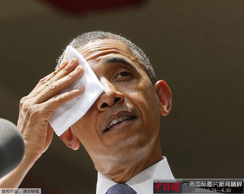 周二(25日),美国华盛顿,美国总统奥巴马在乔治城大学就气候变化发表讲话,由于天气炎热,奥巴马用手帕擦汗。