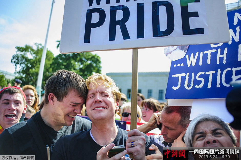 周三(26日),美国最高法院推翻了《婚姻保护法》(Defense of Marriage Act)。图为克纳彭(Michael Knaapen)和丈夫贝克(John Becker)在听到裁决后在法院外相互拥抱。