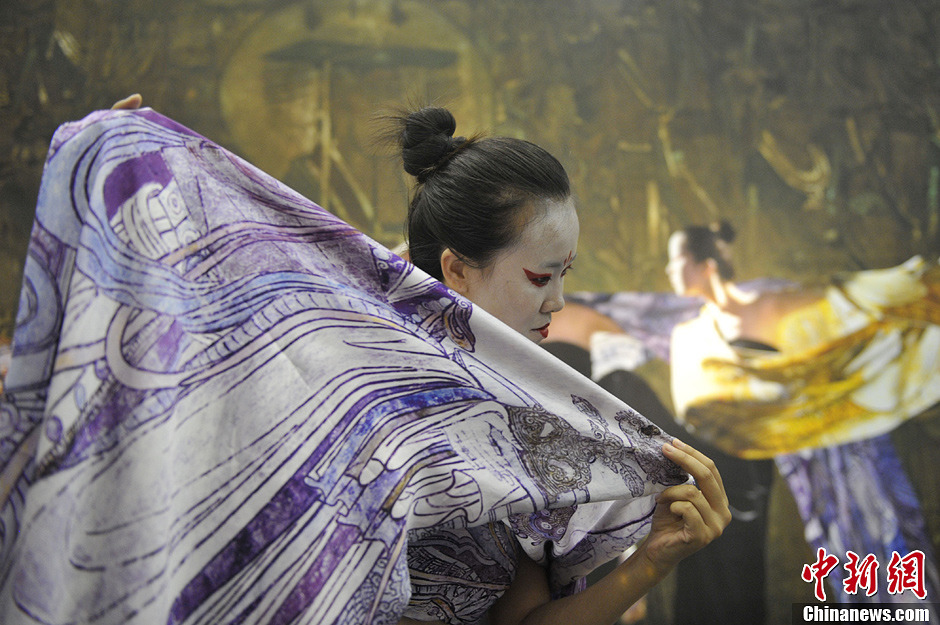 舞蹈表演者展示蚕丝巾上的永乐宫壁画