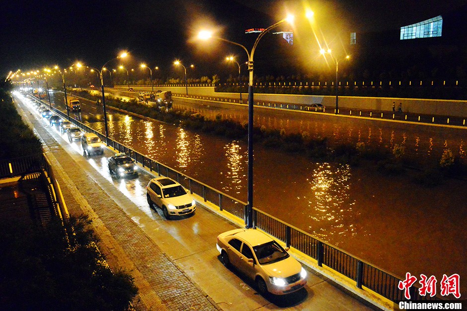 内蒙古呼和浩特突降暴雨 桥下积水“人车难行”