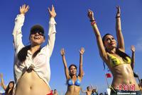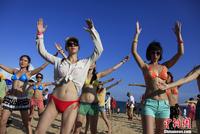 6月30日,一场时尚健康节千人比基尼派对在海南三亚海棠湾举行,众多青年男女身着比基尼,在海滩上舞动着ZUMBA舞、太极等,演绎时尚健康。中新社发 尹海明 摄