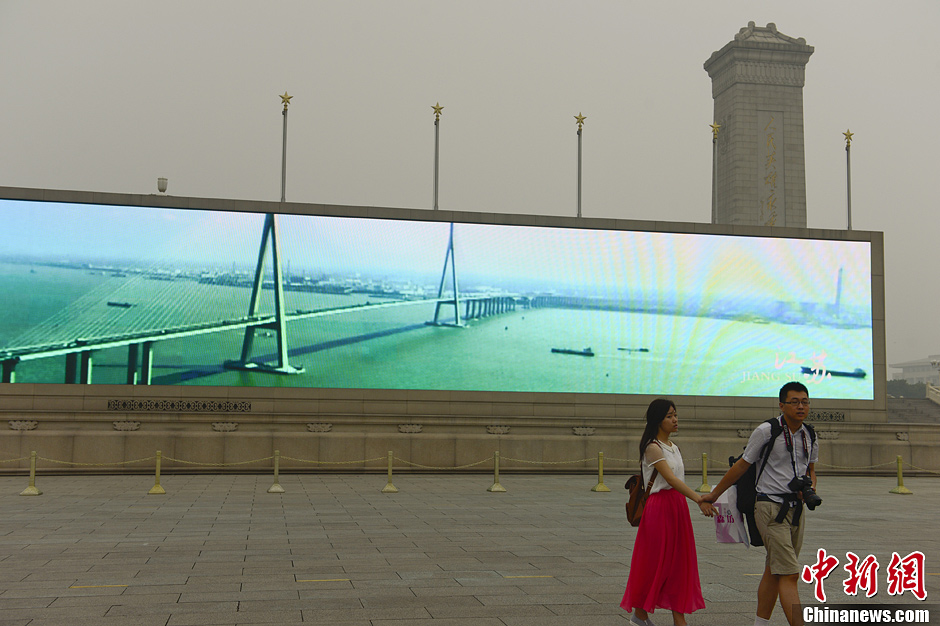 7月1日,一对情侣在天安门广场游玩。从上月28日开始至今,北京已连续4天出现重度污染天气,其中大部分时间,北京市区细颗粒物浓度达到6级严重污染。中新社发 刘震 摄