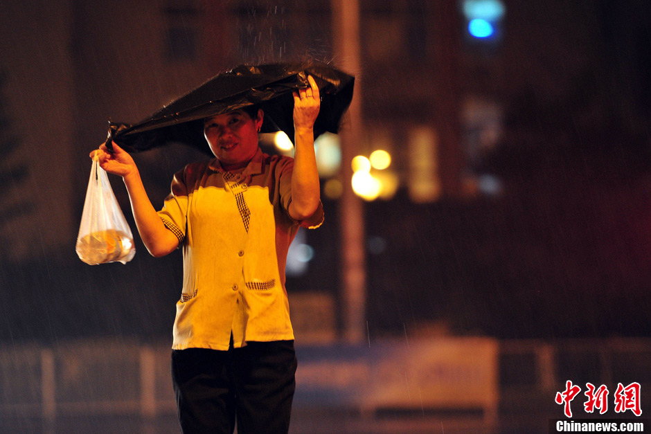 7月1日夜间,北京市城区降下大雨,局地迎来暴雨。据北京市气象台统计,1日11时到23时,城区降雨量25.6毫米;最大降雨量在大兴庞各庄71.3毫米,已达暴雨量级。2日白天,阴霾笼城、重污染多日的北京城将告别雨水迎来晴天,气温回升。图为夜间行人在大雨中穿过马路。中新网记者 金硕 摄