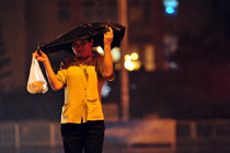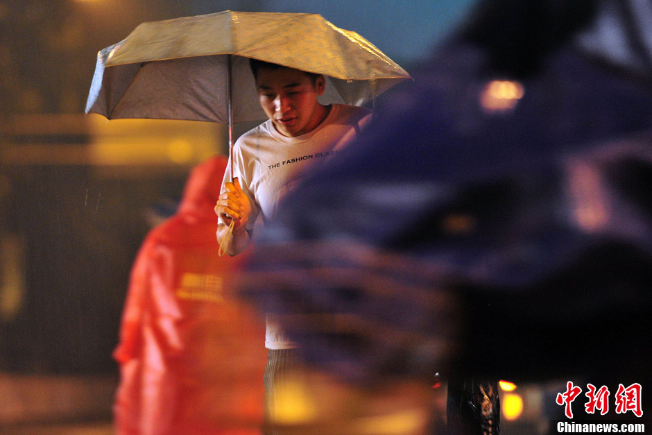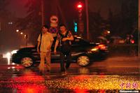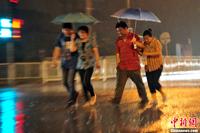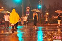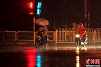 7月1日夜间,北京市城区降下大雨,局地迎来暴雨。据北京市气象台统计,1日11时到23时,城区降雨量25.6毫米;最大降雨量在大兴庞各庄71.3毫米,已达暴雨量级。2日白天,阴霾笼城、重污染多日的北京城将告别雨水迎来晴天,气温回升。图为夜间行人在大雨中穿过马路。中新网记者 金硕 摄
