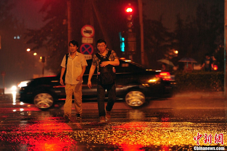7月1日夜间,北京市城区降下大雨,局地迎来暴雨。据北京市气象台统计,1日11时到23时,城区降雨量25.6毫米;最大降雨量在大兴庞各庄71.3毫米,已达暴雨量级。2日白天,阴霾笼城、重污染多日的北京城将告别雨水迎来晴天,气温回升。图为夜间行人在大雨中穿过马路。中新网记者 金硕 摄