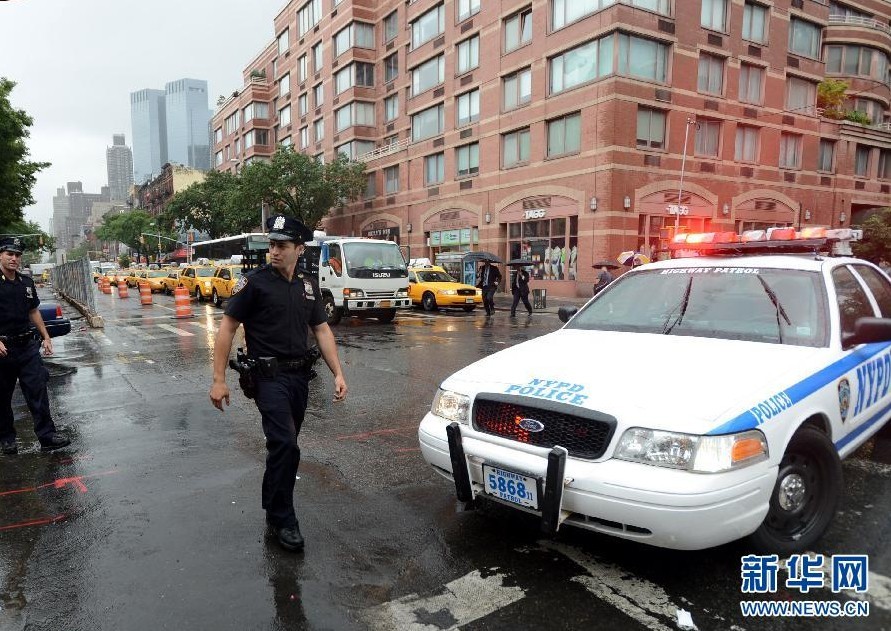7月1日,美国纽约,一名警察在发生枪击案路口警戒。当天上午,纽约曼哈顿区中城49街附近发生一起枪击案,一名建筑工人遭到枪手袭击,胸部中弹,目前已送往医院紧急抢救,嫌犯仍持枪在逃。王雷 摄 图片来源:新华网