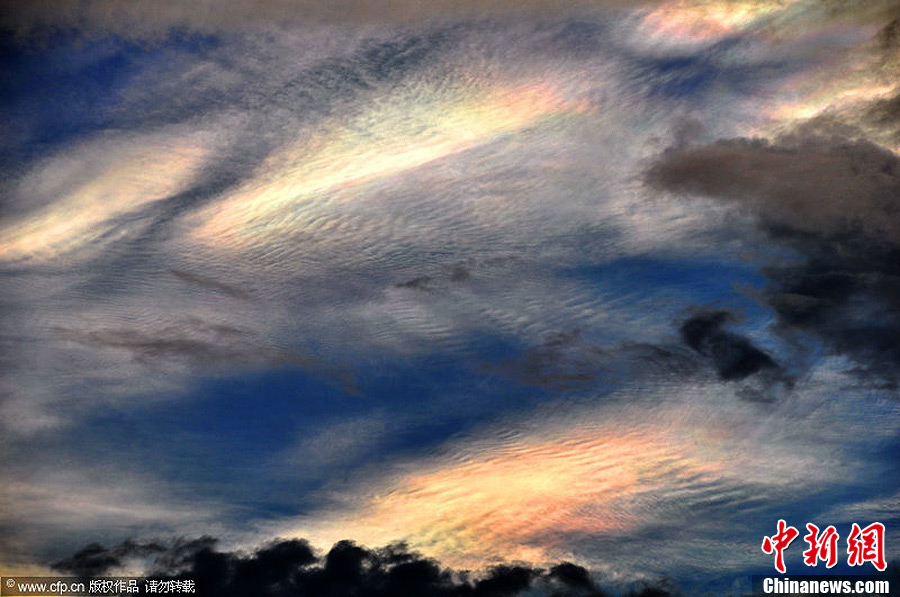 7月1日傍晚,江西遂川,雨后天空,呈现五色彩云,斑驳陆离,绚丽多姿。当日傍晚6时40分左右,江西吉安遂川县西部上空出现了一道奇特的彩光祥云,淡淡少许绿色、黄色与红色等云彩现出天空上,色彩斑斓,引得路人纷纷停下脚步观看这一奇异天象。肖远泮 摄 图片来源:CFP视觉中国