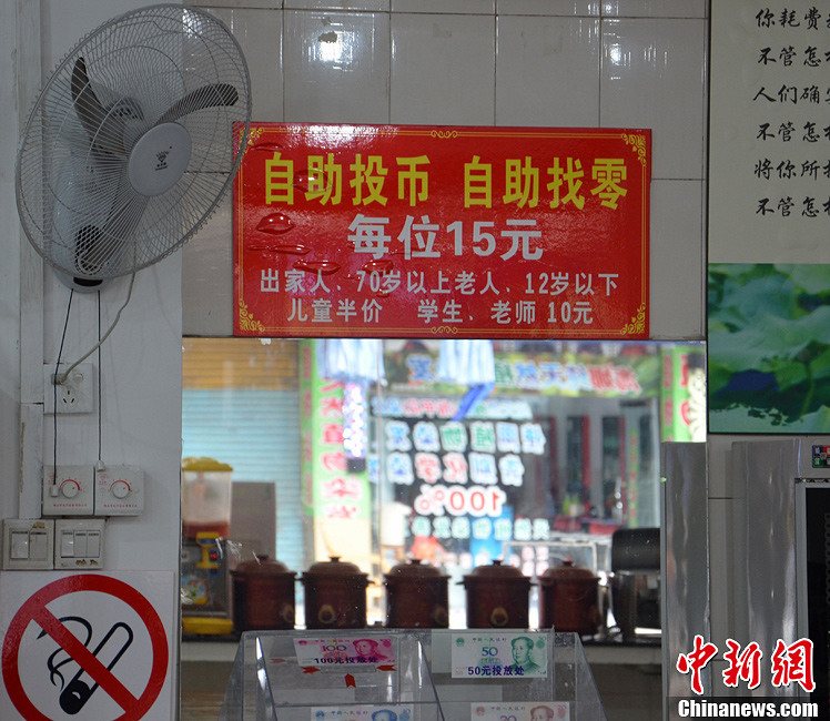 7月2日,广东肇庆4名大学生在城区开张该省首个自助投币素食餐厅,顾客用餐每位15元人民币,出家人、70岁以上老人、12岁以下儿童半价,教师和学生只需花10元人民币,店内无任何监控视频探头,也无店内员工监督,全凭顾客自助投币找零,自觉“埋单”。4名老板之一的余伟宁说,他们店在6月13日开张后成了市民素质的“试金石”,店里做到收支平衡,没发现故意逃单或者偷卷钱财的现象。图为顾客自助投币处。中新社发 黄耀辉 摄