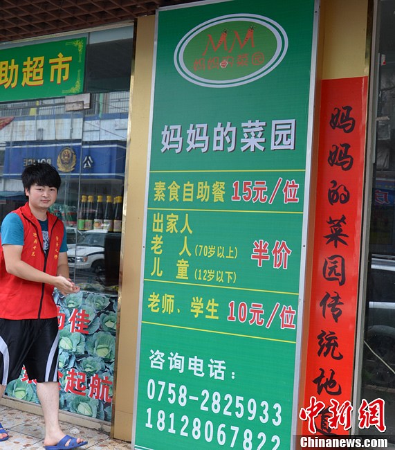 7月2日,广东肇庆4名大学生在城区开张该省首个自助投币素食餐厅,顾客用餐每位15元人民币,出家人、70岁以上老人、12岁以下儿童半价,教师和学生只需花10元人民币,店内无任何监控视频探头,也无店内员工监督,全凭顾客自助投币找零,自觉“埋单”。4名老板之一的余伟宁说,他们店在6月13日开张后成了市民素质的“试金石”,店里做到收支平衡,没发现故意逃单或者偷卷钱财的现象。图为该店门前的招牌。中新社发 黄耀辉 摄