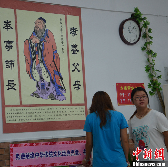 7月2日,广东肇庆4名大学生在城区开张该省首个自助投币素食餐厅,顾客用餐每位15元人民币,出家人、70岁以上老人、12岁以下儿童半价,教师和学生只需花10元人民币,店内无任何监控视频探头,也无店内员工监督,全凭顾客自助投币找零,自觉“埋单”。4名老板之一的余伟宁说,他们店在6月13日开张后成了市民素质的“试金石”,店里做到收支平衡,没发现故意逃单或者偷卷钱财的现象。图为店内的“孔子文化”。中新社发 黄耀辉 摄
