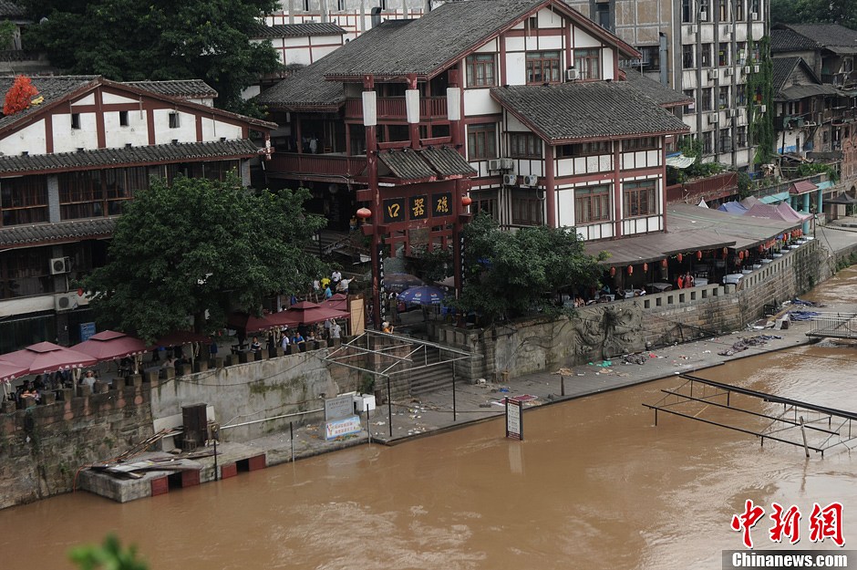 7月2日,嘉陵江重庆段水位逐渐上涨,千年古镇磁器口不少商铺开始搬离货物,已有不少的商铺已经被洪水淹没。据悉,重庆海事局已将橙色预警提升为红色水上交通安全预警。这是2013年入汛以来首个红色预警。中新社发 陈超 摄