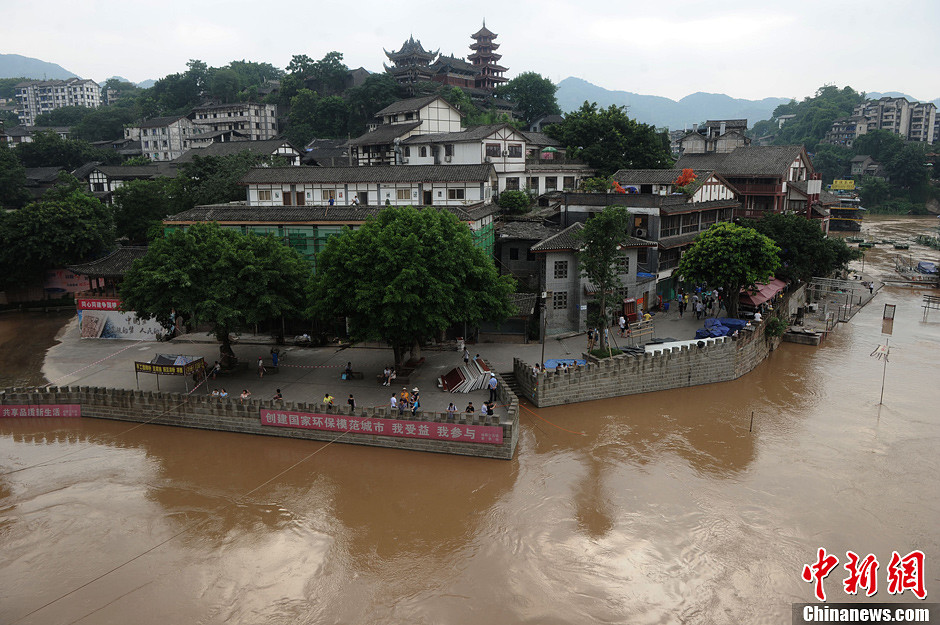 7月2日,嘉陵江重庆段水位逐渐上涨,千年古镇磁器口不少商铺开始搬离货物,已有不少的商铺已经被洪水淹没。据悉,重庆海事局已将橙色预警提升为红色水上交通安全预警。这是2013年入汛以来首个红色预警。中新社发 陈超 摄
