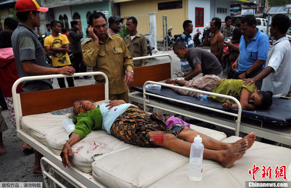 美国地质勘探局消息称,北京时间2日15时37分,印尼苏门答腊岛北部发生里氏6.1级地震。印度尼西亚官员2日说,当天下午发生在苏门答腊岛的地震造成当地至少5人死亡,逾200人受伤。图为伤者在当地诊所接受治疗。