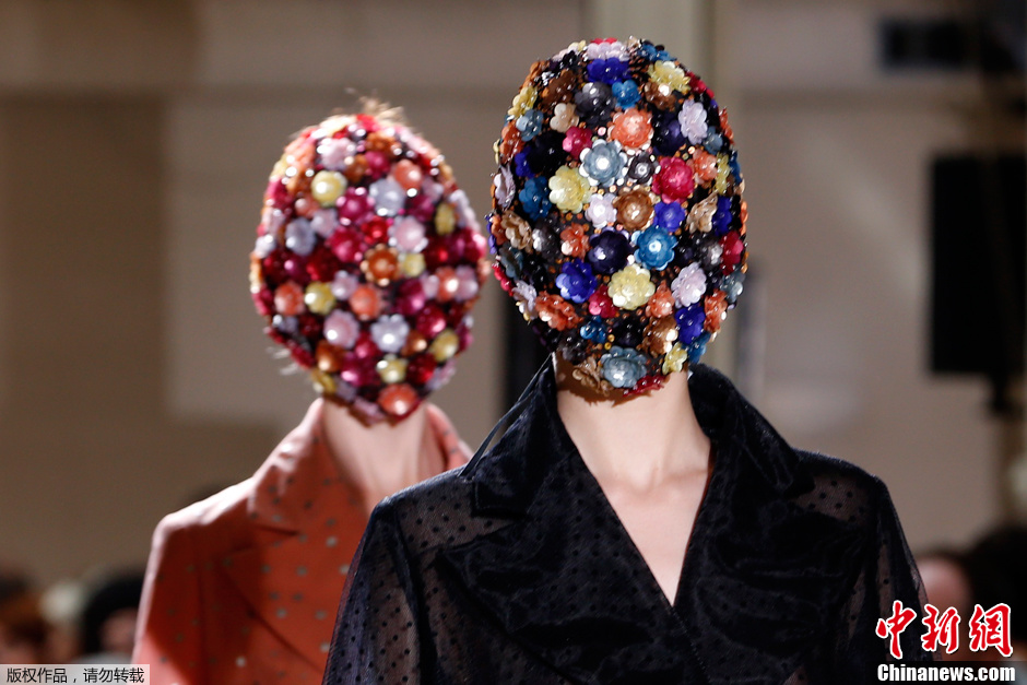今年巴黎秋冬时装周上,独特时尚的造型以及夸张的头饰装扮在T台上得以完美大胆地呈现,成为吸引眼球的又一风景。图为当地时间2013年7月3日,模特在巴黎时装周上走秀。