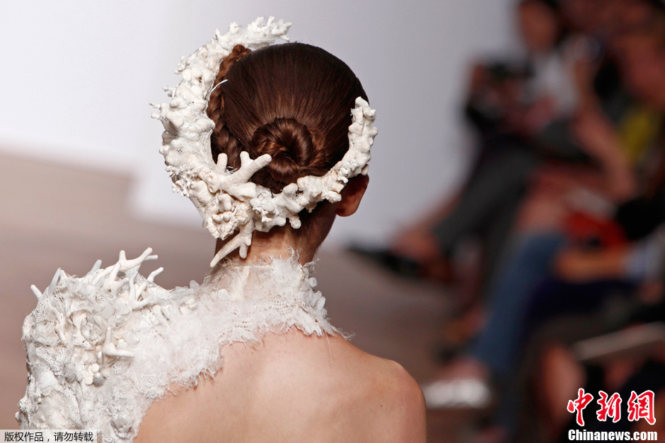今年巴黎秋冬时装周上,独特时尚的造型以及夸张的头饰装扮在T台上得以完美大胆地呈现,成为吸引眼球的又一风景。图为当地时间2013年7月3日,模特在巴黎时装周上走秀。