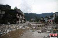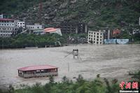 4日,北川唐家山堰塞湖区域周边乡镇普降暴雨,湖面水位抬升,下泄洪水流经老县城遗址超过2008年地震后“6.10”泄洪水位5 mm,致使北川老县城部分遗址被洪水淹没。截至目前未出现人员伤亡。中新社发 杨超 摄