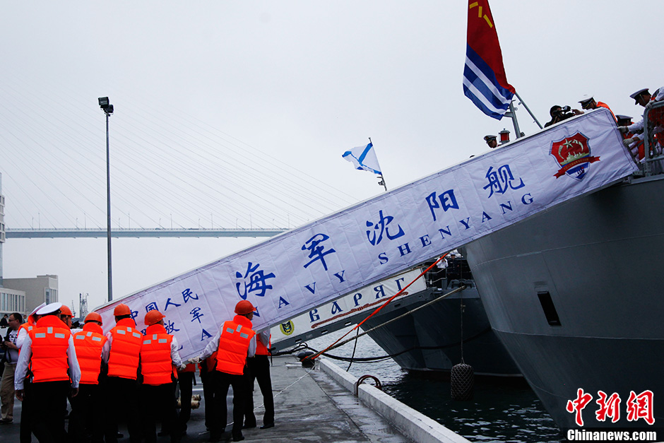 当地时间7月5日,由4艘驱逐舰、2艘护卫舰和1艘综合补给舰组成的中国海军舰艇编队,抵达俄罗斯太平洋舰队司令部所在地符拉迪沃斯托克,“海上联合-2013”中俄联演揭幕。“海上联合-2013”中俄联合军演5日至12日在日本海彼得大帝湾举行。中新社发 陶社兰 摄