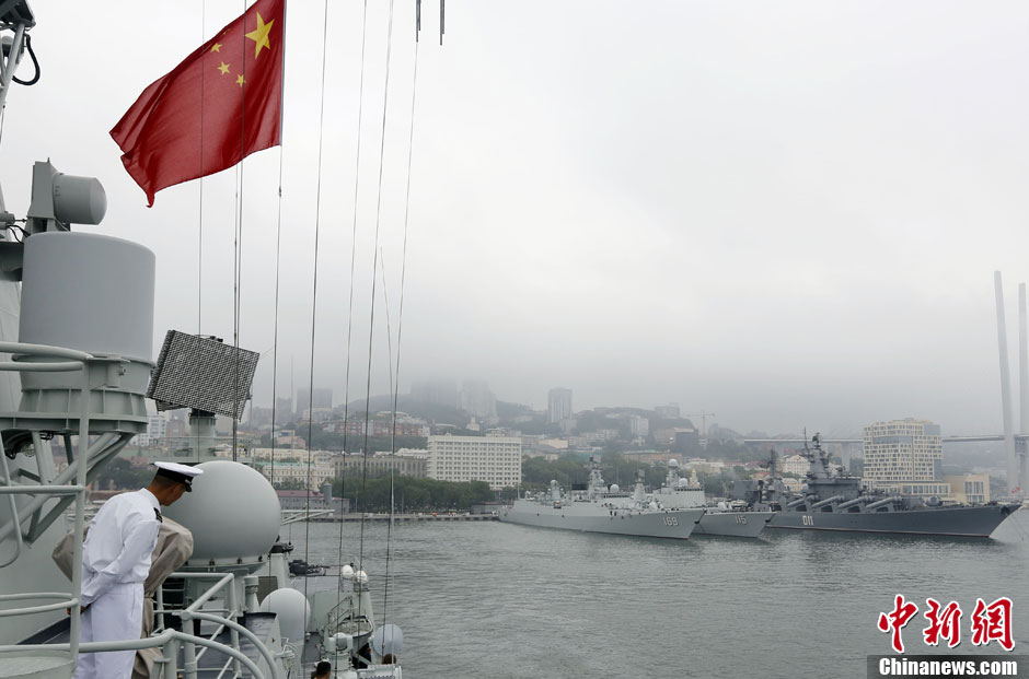 当地时间7月5日,参加中俄“海上联合—2013”演习的中方7艘舰艇抵达俄罗斯符拉迪沃斯托克。“海上联合-2013”中俄联合军演5日至12日在日本海彼得大帝湾举行。中新社发 盛佳鹏 摄