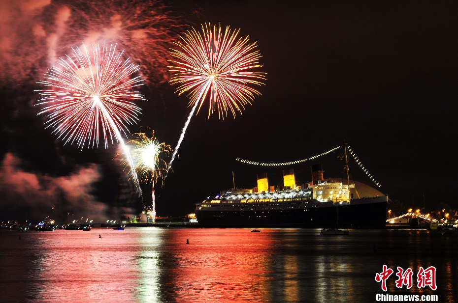 当地时间7月4日晚,永久停靠在洛杉矶长滩(long beach)的玛丽皇后号游轮旁燃放璀璨焰火,庆祝美国第237个独立日。中新社发 毛建军 摄