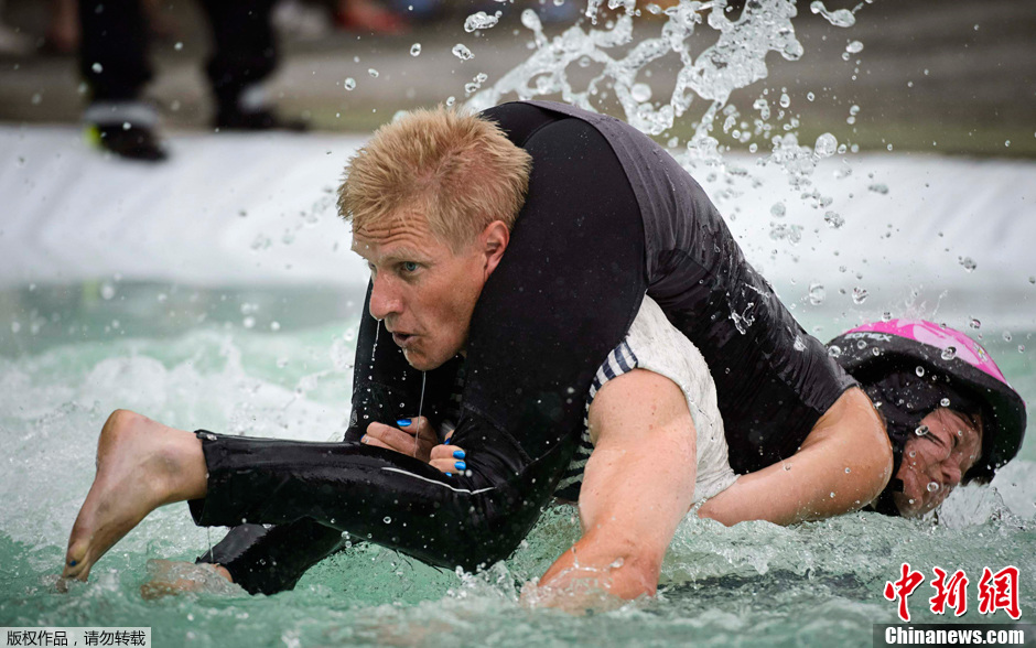 当地时间2013年7月6日,芬兰松卡哈维举行世界“背老婆”锦标赛。现场妙趣横生。背老婆大赛最早出现在芬兰的松卡哈维,要求男子携女性队友在最短时间内完成一段障碍赛。