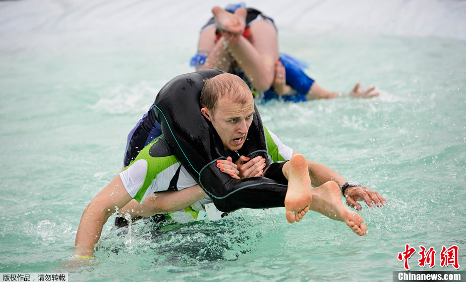 当地时间2013年7月6日,芬兰松卡哈维举行世界“背老婆”锦标赛。现场妙趣横生。背老婆大赛最早出现在芬兰的松卡哈维,要求男子携女性队友在最短时间内完成一段障碍赛。
