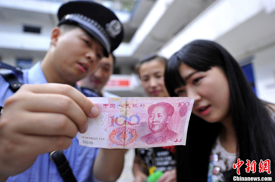 7月8日,湖北省保康县公安局城关派出所民警向群众展示M3W9开头的百元假币,提醒群众谨防上当受骗。杨韬 摄 图片来源:东方IC 版权作品 请勿转载