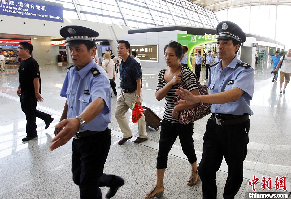 7月8日,韩亚空难遇难者家属从上海出发赴美。日前,韩国韩亚航空公司一架波音777客机在美国旧金山机场着陆时失事,其中来自浙江江山的两名中学生王琳佳与叶梦圆遇难。图为王琳佳的父母从上海出发赴美。中新社发 汤彦俊 摄