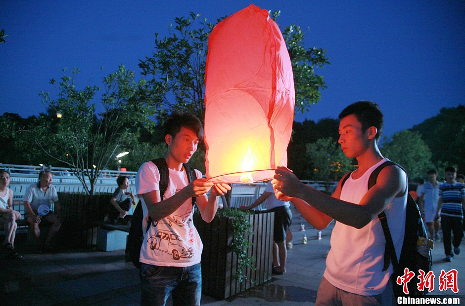 7月8日,市民在浙江省江山市须江公园内为韩亚空难遇难中国女生默哀祈福并燃放孔明灯。7日凌晨,在美国旧金山国际机场着陆时失事的韩亚航空公司波音777型客机已经造成至少2人死亡,韩亚航空向浙江江山市政府发去传真,称根据登机牌,参加江山中学赴美夏令营的两名女生王琳佳和叶梦圆在此次空难中不幸罹难。中新社发 李晨韵 摄