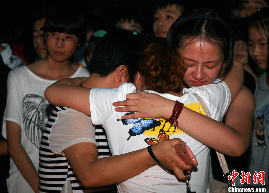 7月8日,市民在江山市须江公园内为韩亚空难遇难中国女生默哀祈福,不少师生无法压抑内心的悲痛痛哭流泪。7日凌晨,在美国旧金山国际机场着陆时失事的韩亚航空公司波音777型客机已经造成至少2人死亡,韩亚航空向浙江江山市政府发去传真,称根据登机牌,参加江山中学赴美夏令营的两名女生王琳佳和叶梦圆在此次空难中不幸罹难。中新社发 李晨韵 摄