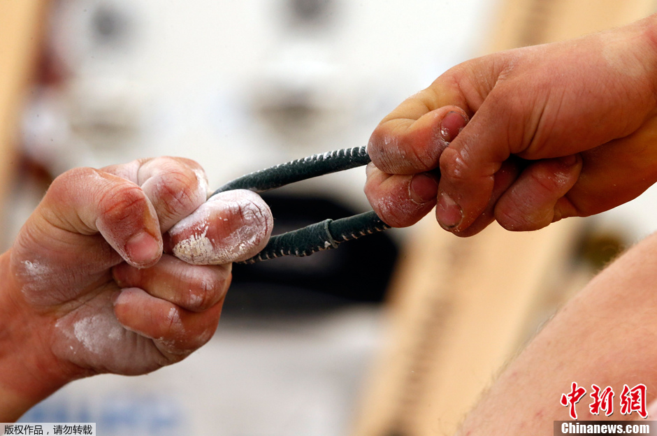 当地时间2013年7月7日,德国小镇米登华德举行传统巴伐利亚手指角力大赛。图为大力士们展示了他们过人的指力。