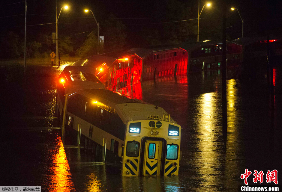 当地时间2013年7月8日,加拿大多伦多遭遇大暴雨,导致该市大面积断电,地铁停运和路面交通瘫痪。图为一辆列车被洪水淹没。