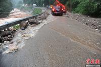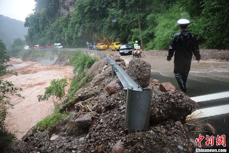 7月10日上午,四川省都江堰中兴镇三溪村发生大面积山体崩塌,经初步统计有11户房屋被毁、约30余名群众被埋,现场塌方体量大,约2平方公里。灾情发生后,为保障抢险救援工作的顺利开展,都江堰官方对通往泥石流现场的道路实行了交通管制。图为通往泥石流现场的道路被毁。张浪 摄