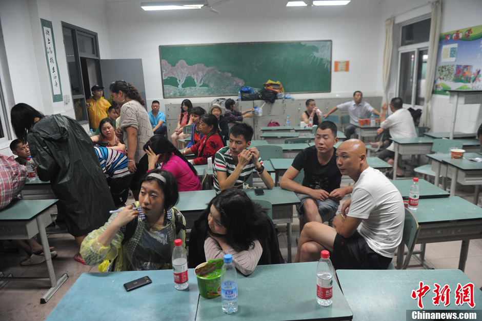 7月10日,都江堰中兴镇三溪村发生特大型高位山体滑坡,导致11户村民房屋被毁。当日晚,从山体滑坡灾区转移出来的数百被困人员在中兴九年制学校得到妥善安置,一些失踪者家属也从远处赶来,在这里焦急等待着亲人的消息。图为安置点现场。中新社发 张浪 摄