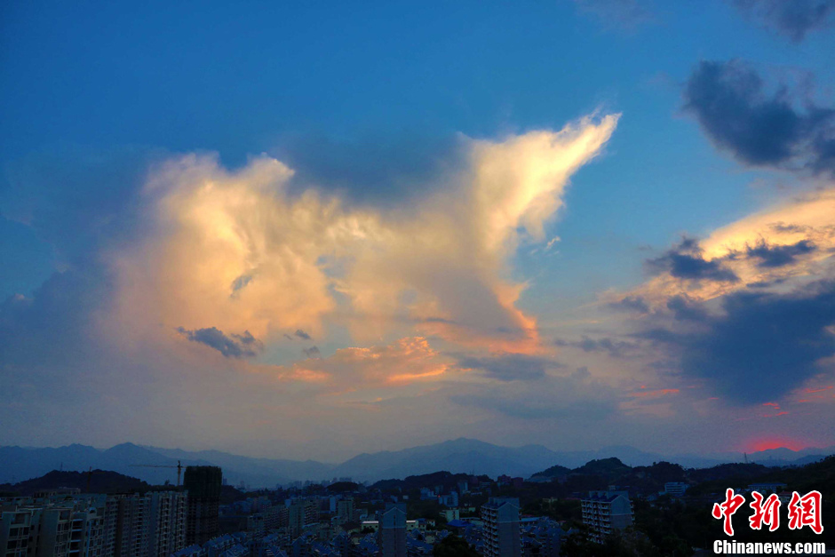 7月10日傍晚,由于台风“苏力”影响,福州市区天空风云变幻,多次出现天狗的造型,美不胜收。据气象台预告:今年第七号台风“苏力”已经转为超强台风。预计可能13日左右在闽浙交界处登陆。杨婀娜 摄