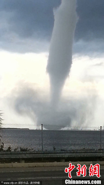 当地时间2013年7月8日,美国佛罗里达州,16岁的Jandy Sun和家人开车经过坦帕湾时,他拍下了罕见的水上龙卷风的奇特景观。巨大的水柱从水面一直延伸到高空,奇特壮观。水上的龙卷风,通常是在水上的非超级单体龙卷风,也被称为龙吸水。龙吸水是一种偶尔出现在温暖水面上空的龙卷风,它的上端与雷雨云相接,下端直接延伸到水面,一边旋转,一边移动。这是一种涡旋,空气绕龙卷的轴快速旋转。图片来源:CFP视觉中国