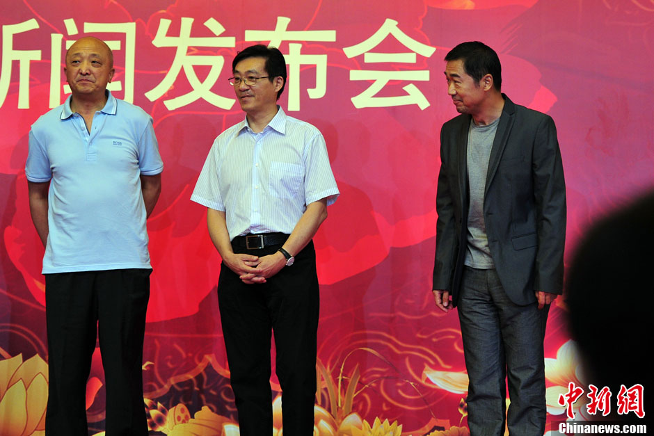 7月12日下午三时,2014年央视春晚在北京举行发布会,揭秘各项具体事项,包括公布导演名单。图为发布会现场,艺术顾问团队的张国立(右)、刘恒(左)、印青亮相。中新网记者 金硕 摄