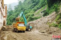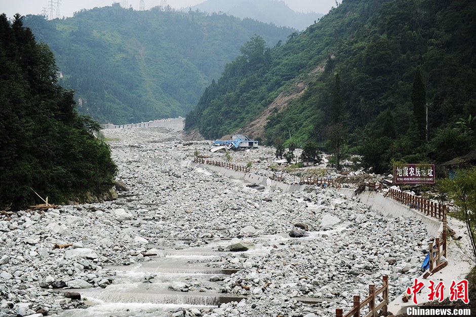 7月15日,再遭暴雨泥石流侵袭的四川汶川县映秀镇灾后恢复正在全力展开。此次“7.10”暴雨泥石流灾害导致该镇张家坪、黄家园、老街村三个村镇不同程度受灾,由于当地政府处置转移民众及时没有人员伤亡,目前,当地受损电网已抢通,受灾民众也已临时集中安置在当地两所学校过度。图为发生泥石流的地震震源点牛圈沟。中新社发 刘忠俊 摄
