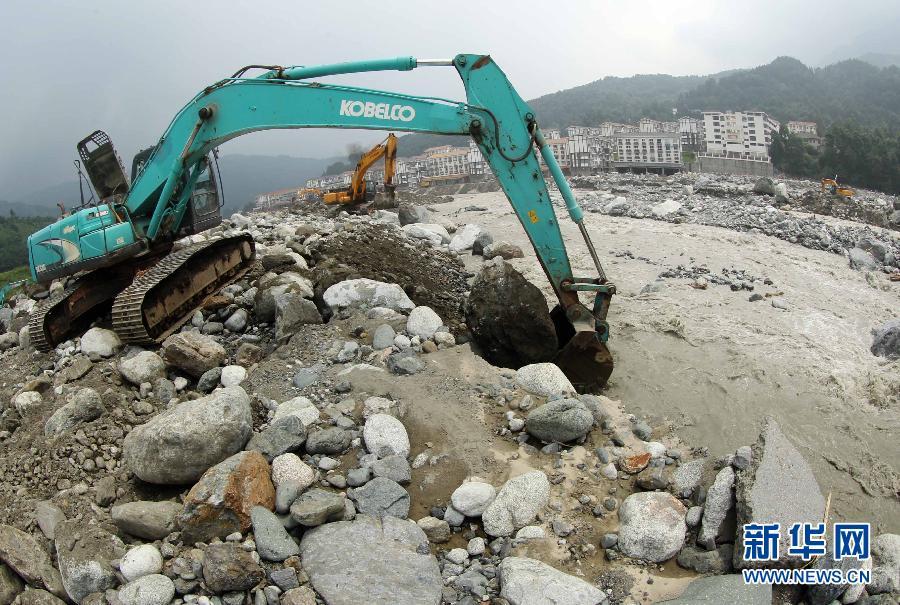 7月15日,大型机械在四川省彭州市龙门山镇沿白水河河床疏通河道。图片来源:新华网