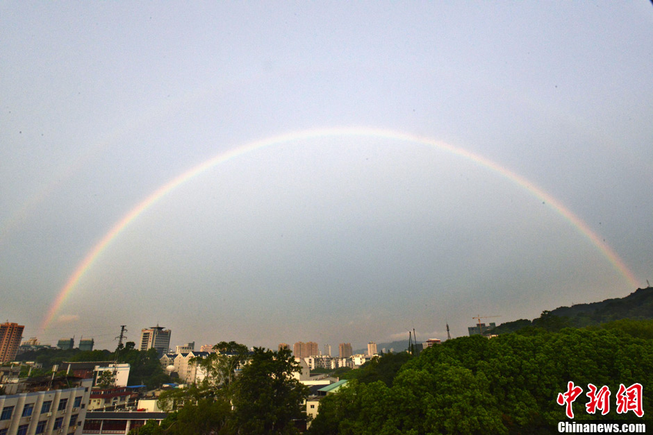 7月16日早上5:30许,福州出现罕见“双彩虹”,双层彩虹犹如美丽大桥横跨福州城。中新社发 郑祚声 摄