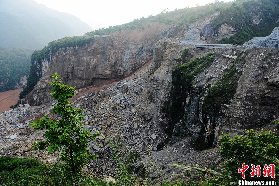7月16日,从四川雅安市汉源县宣传部得到最新消息:因持续强降雨,致汉源县三交乡境内宜交路飞水沟河两岸山体垮塌形成的堰塞湖,当日起开始爆破排险,预计10天完工。据了解,因山体垮塌体下滑造成永定桥水利工程大坝坝址上游三公里处形成的堰塞湖,危及下游7个乡镇群众的生命财产安全。截至目前,水位已上涨40米左右,堰塞体约60万立方米,堰塞湖水量约200万立方米。图为山体垮塌。中新社发 钟欣 摄