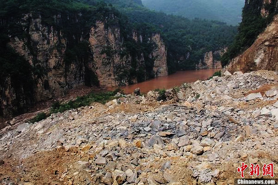 7月16日,从四川雅安市汉源县宣传部得到最新消息:因持续强降雨,致汉源县三交乡境内宜交路飞水沟河两岸山体垮塌形成的堰塞湖,当日起开始爆破排险,预计10天完工。据了解,因山体垮塌体下滑造成永定桥水利工程大坝坝址上游三公里处形成的堰塞湖,危及下游7个乡镇群众的生命财产安全。截至目前,水位已上涨40米左右,堰塞体约60万立方米,堰塞湖水量约200万立方米。图为山体垮塌形成的堰塞湖。中新社发 钟欣 摄